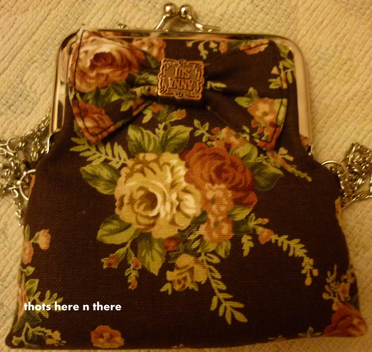 A small and cute Anna Sui bag with a long sling. This little bag is Lyn's. Real girly kind of thing.